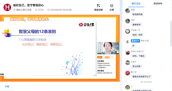 2022年7月16日,由高新区社会事业局、高新区校外未成年人心理健康辅导站主办,安徽徽韵心理咨询有限公司承办的暑期家庭教育系列课程如期开展。第1讲“做好自己,坚守育孩初心”邀请到国家二级心理咨询师胡君玲老师主讲,与高新区的家长们一起聊一聊如何学做智慧型家长。