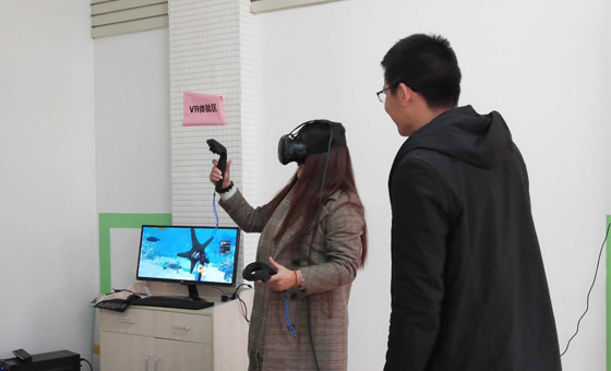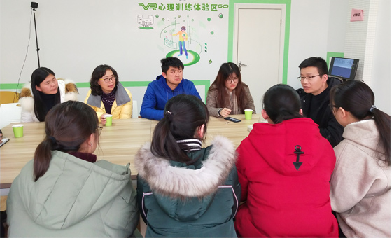 在体验完徽韵自主研发的VR心理训练系统后,老师们与孙总及六名实习生开展了一场座谈会。会议主题围绕学生们在实习工作中的遇到的问题和取得的收获,实习生依次向老师和孙总汇报了自己在实习期间的工作内容,并根据自己的实践经验提出了对学校专业未来发展的建议。余书记、胡志海教授及辅导员们向实习生们提出自己的期许,表达了自己的祝福。关于未来与学院的交流与合作,孙总也提出了自己的几点建议。会议结束后,孙总携胡教授等五位老师参观和体验了心理健康宣教平台等其他徽韵自主研发的心理设备和产品。
