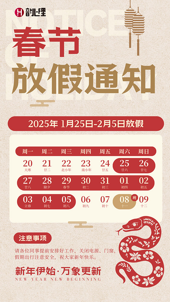 2025年春节在即,根据国务院办公厅通知精神及公司福利政策,本司春节期间的放假安排如下:
