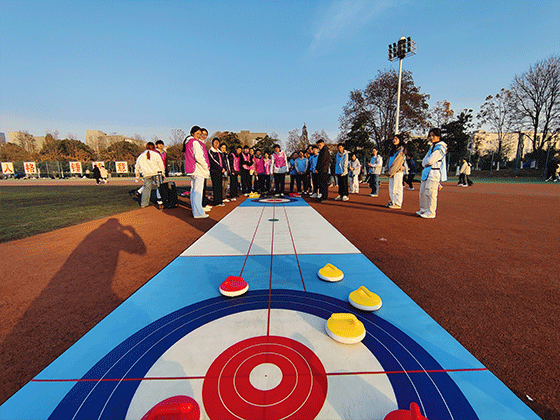 最后的“旱地冰壶”项目最受欢迎。这项运动既有趣味又有技巧,还需要动脑筋。同学们认真研究投壶路线,商量战术策略。“轻一点!”“瞄准红壶!”场边不时传来指导声。每当打出精彩一击,都会引来阵阵欢呼。5轮比赛结束后,同学们仍意犹未尽地讨论着刚才的战术。